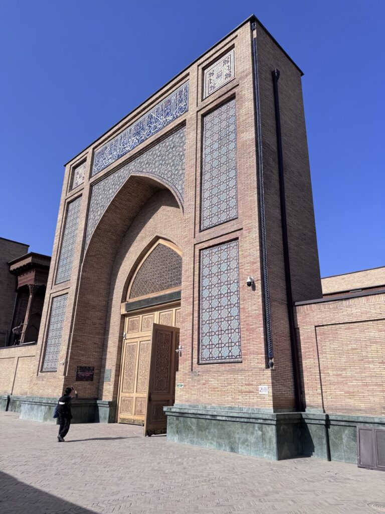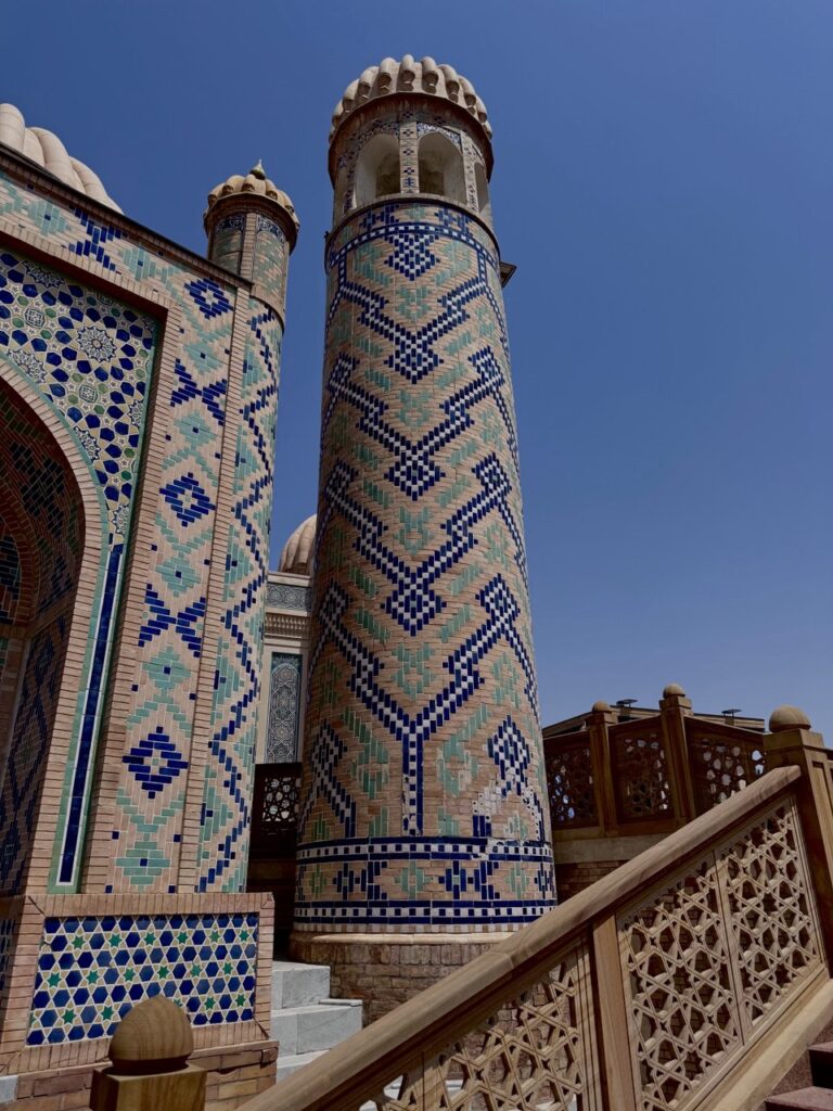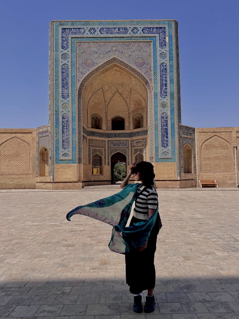 Masjid dengan detail tiang kayu dan arsitektur memukau ini terletak di dataran lebih tinggi, tak jauh dari Shah-i-Zinda. Dari teras masjid ini pengunjung bisa melihat panorama kota tua Samarkand, sekaligus menikmati suasana tenagn setelah kunjungan ke situs makam. Banyak spot foto yang Instagramable dari tiap sudutnya, nggak heran kalo di sini tuh selalu rame pengunjung berfoto.