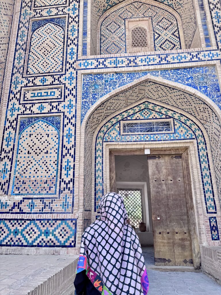 Pola mozaik geometris & kufic khas Sheybanid, permukaan dinding yang sangat kaya dengan detail faience tiles. Di tengahnya ada lapangan luas dengan dua lantai dihiasi jendela berlengkung simetris yang semakin menambah pesona kemegahan bangunan khas Bukhara.
