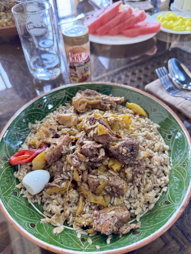 Wisata tanpa kuliner itu kurang lengkap rasanya, ya! Jadi, setelah mengelilingi beberapa destinasi ikonik, kami meminta rekomendasi tempat makan khas di sini. Si akang pemandu yang mirip Zein Malik lokal ini mengantarkan kami ke restoran plov yang katanya legendaris, sekaligus mengakhiri petualangan kami di Kota Bukhara.